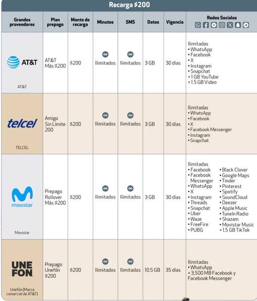En cuanto a redes sociales, todas dan de manera ilimitada WhatsApp y Facebook; pero Movistar da redes ilimitadas en torno a 24 aplicaciones, excepto Youtube. Mientras que Unefon solamente da WhatsApp y 3 mil 500 megabytes de Facebook y FB Messenger. Por su parte, AT&T da Instagran y Snapchat ilimitado, así como 1 gigabyte de YouTube y 1.5 gigabytes de Video.