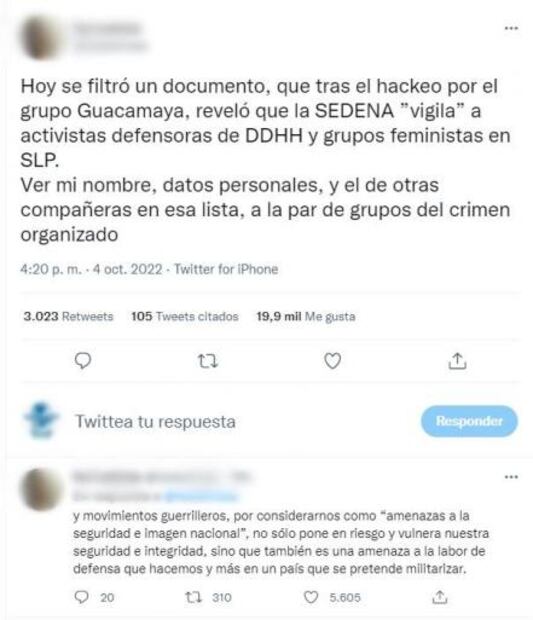 La filtración de este documento ha puesto en alerta a las activistas potosinas quienes han mencionado que usar al ejército para vigilar a las mujeres que luchan por la vida y dignidad de otras, es una total violación a los derechos humanos. Si bien las fuerzas militares no han accionado, otros entes sociales tienen acceso a sus datos y eso las coloca en riesgo.