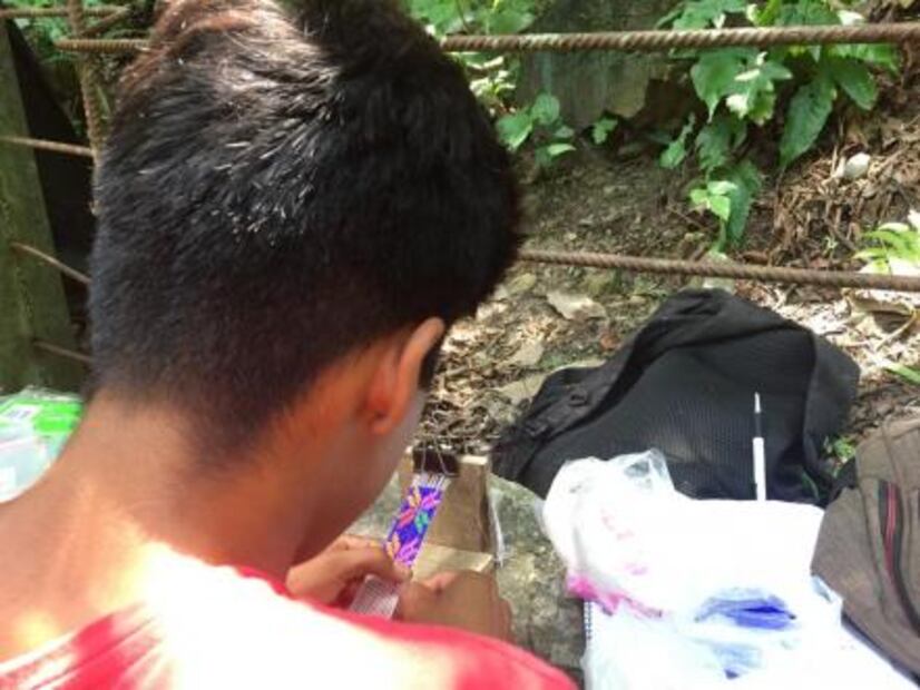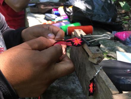 Efraín domina un poco más el “minitelar de chaquira”, en este telar diminuto, que improvisa con un pedazo de madera y un clip para carpetas, monta hasta 16 hilos de color blanco o más dependiendo del grosor de la pulsera o collar que va a realizar. Con una aguja incrustada en un hilo transparente va tomando los colores de las chaquiras que ocupa para ir montando el diseño final, que previamente trazó en una libreta para irse guiando.