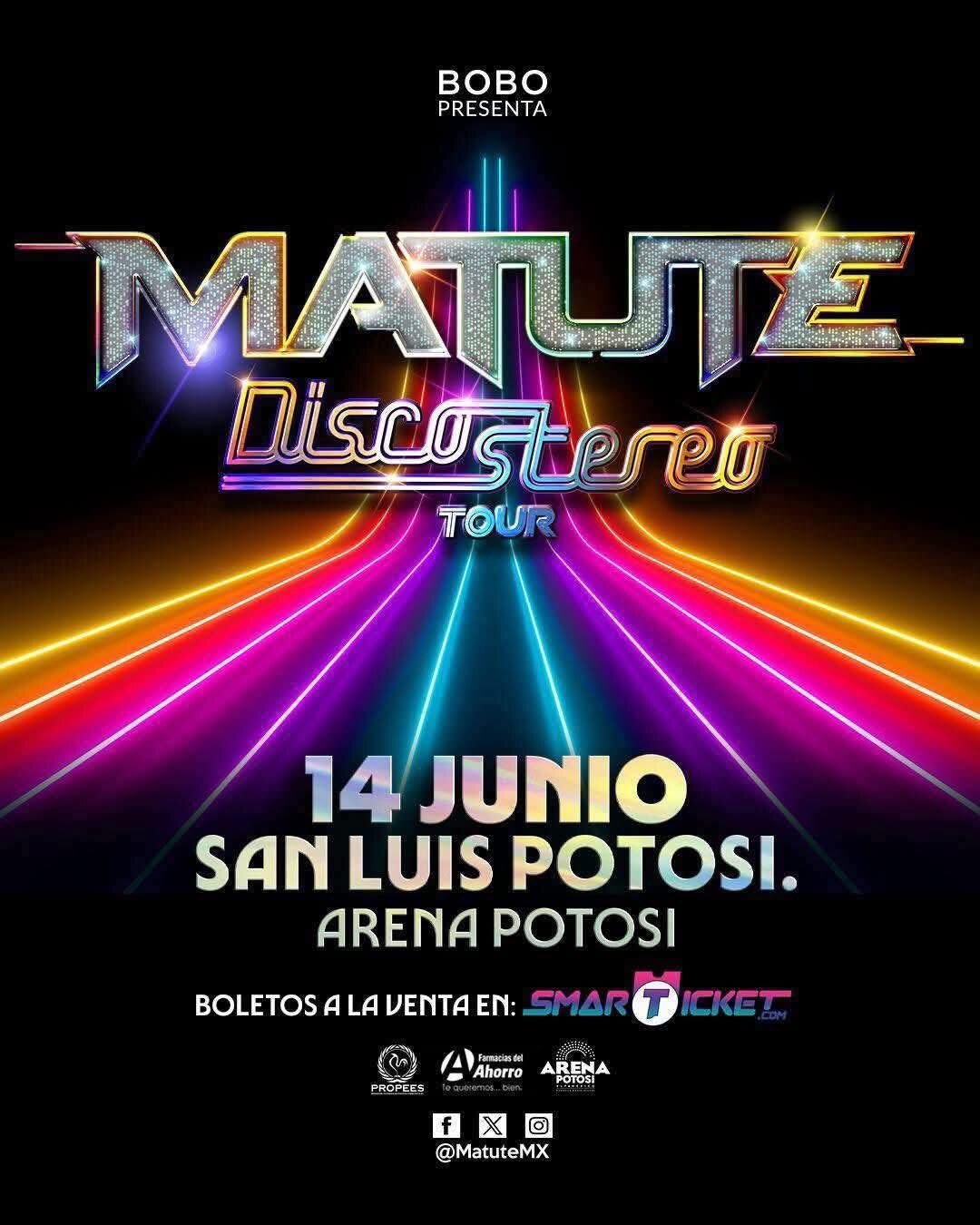 La banda Matute regresa con su gira Disco Stereo para revivir los éxitos más icónicos de los 70, 80 y 90. El concierto será el 14 de junio en la Arena Potosí a las 21:00 horas. Boletos disponibles en Smarticket desde 500 hasta 2 mil 900 pesos.