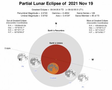 El eclipse que presenciaremos este 19 de noviembre pertenece a Saros 126 y es el número 45 de los 70 eclipses de la serie.