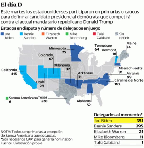 Al cierre de esta edición, el recuento final de delegados que se iba a llevar cada candidato no estaba completo, y había un empate técnico en la segunda joya de la noche: Texas. Lo que sí quedó claro es que la estrategia del partido con Biden funcionó y que el concepto de “momentum”, el empuje temporal de un candidato, tiene un efecto brutal en el electorado.