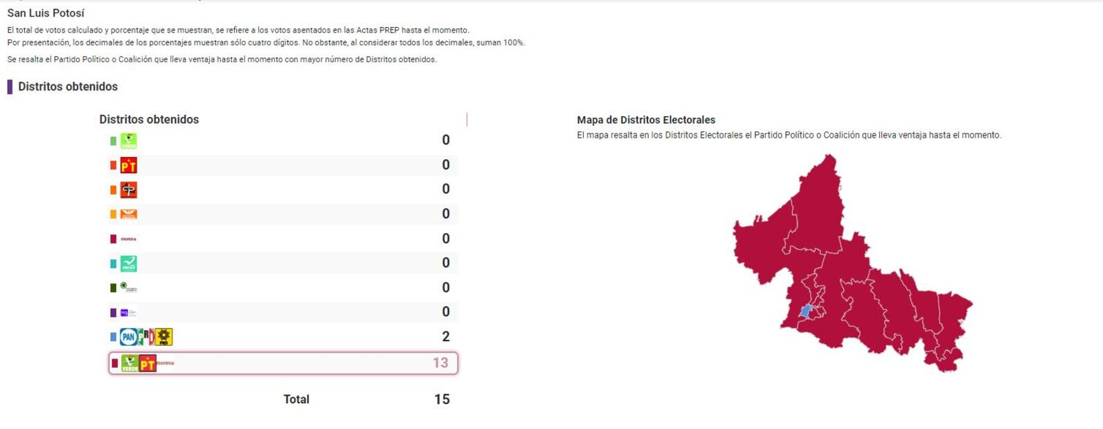 Desde poco antes de las tres de la tarde de este lunes 3 de junio y más de un 90 por ciento de las votaciones contadas, llevan la delantera 13 candidatas y candidatos del PVEM-PT-Morena “Juntos haremos historia” y sólo 2 de la coalición “Fuerza y corazón por San Luis”, PRI, PAN y PRD.