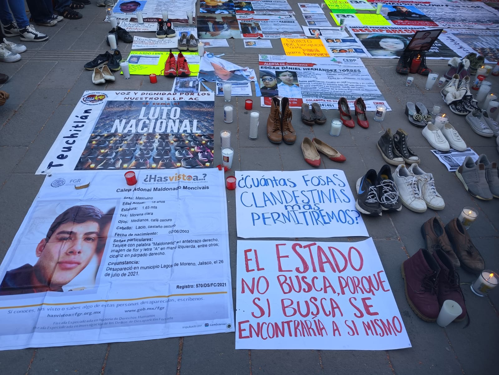 En el suelo, una hilera de tenis representaba las vidas arrebatadas; carteles con rostros desaparecidos recordaban las ausencias y veladoras encendidas simbolizaban la esperanza que se niega a apagarse.