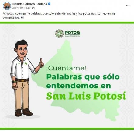 El gobernador de San Luis Potosí Ricardo Gallardo Cardona lanzó la pregunta recientemente y además de que muchos potosinos y seguidores del mandatario confirmaron esta expresión, también hubo una lista que hasta este momento sigue acumulando comentarios.